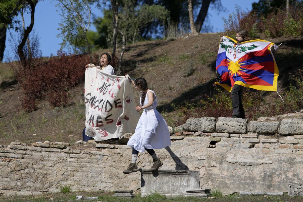 The three activists unfurled a Tibetan flag and ‘No Genocide Games’ banner to oppose the International Olympics Committee’s complicity in human rights violations by letting China host the Winter Olympics. Tibetan-Canadian activist Chemi Lhamo, British activist Jason Leith from Free Tibet and American activist Fern MacDougal were pinned down by security officials after they interrupted the ceremony with slogans in Olympia. The trio are facing charges of attempting to “pollute, damage, and distort” a historical monument, a charge punishable up to five years imprisonment under Greek law.