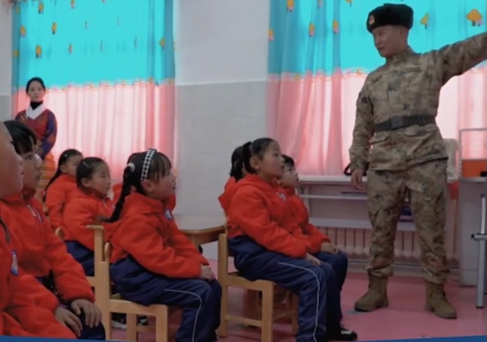 The programme, which began in Nagchu in the so-called Tibet Autonomous Region, currently involves 13 veterans deployed across seven schools, including kindergartens. Chinese state television has aired footage of Tibetan children dressed in military fatigues, raising the national flag, and participating in “civil defence” drills by diving under desks with notebooks on their heads. Kindergarten students were shown listening to “red stories” glorifying the People’s Liberation Army (PLA) and pledging loyalty to Xi Jinping and the Communist Party.