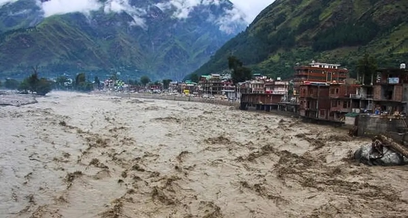 Raging torrents swell the Beas River in Himachal Pradesh’s Mandi district following intense cloudbursts, sweeping away homes and roads.(Photo/NAI)