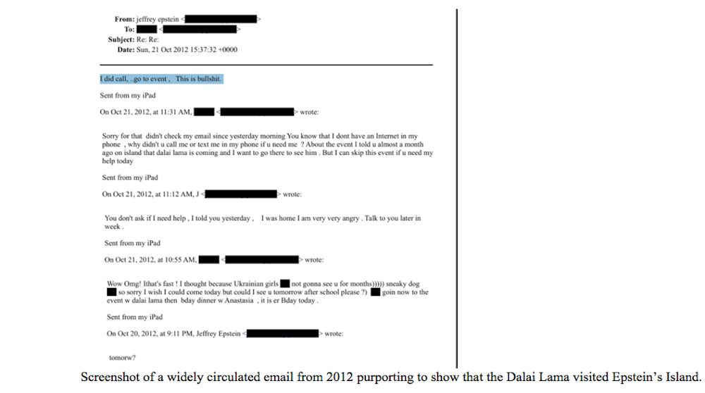 Despite Epstein’s efforts, the records show no direct contact or meetings occurred between him and the Dalai Lama or his office. The widely disseminated disinformation, including by Times of India—about a particular exchange between Epstein and an unidentified female associate on October 21, 2012, purporting to show that the Dalai Lama has visited the island, stems from a deliberate misinterpretation of an exchange. When Epstein asked to meet an unidentified female associate, she declined, writing: “About the event I told u almost a month ago on the island that dalai lama is coming and I want to go there to see him. But I can skip this event if u need my help today.” Epstein replied, “I did call, ..go to event , This is bullshit.” In this context, “on the island” clearly refers to the location where the associate originally informed Epstein of the upcoming visit, rather than suggesting the Dalai Lama was visiting the island itself. The Dalai Lama was merely a topic of conversation; the “event” in question—which took place on October 21, 2012, as the text clearly states—was a public teaching at Lincoln Center in New York, as verified by official records and video footage.